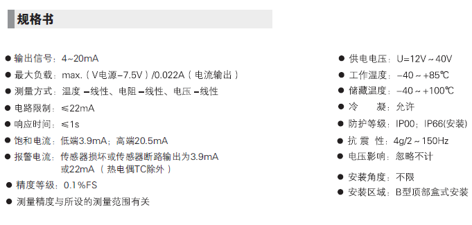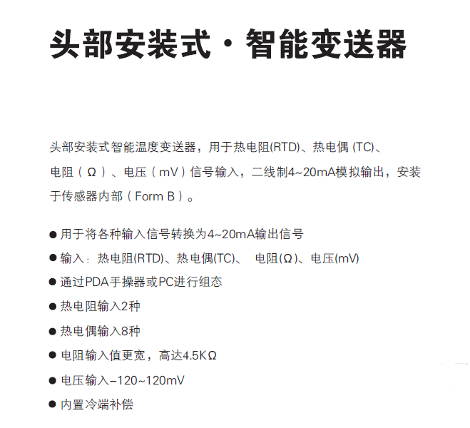 适用于热电阻(RTD) 热电偶(TC) 电阻(Ω )信号输入,二线制4-20mA输出。